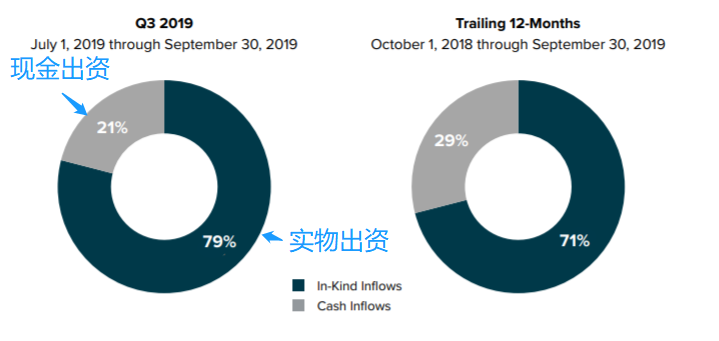 在2019年Q3的报告中,灰度表明从2019年1月到9月,79%的投资者都是选择实物出资(比特币出资)。也就是说,大多数流入GBTC的比特币来自已经在市面上流通的比特币,并不是大家以为的“ 灰度正在购买新挖出来的比特币”。