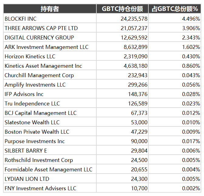 持仓最多的是BlockFi,占有4.5%的 GBTC份额,它是币圈知名的借贷公司。用户存入BTC或ETH获取利息,同时BlockFi也提供贷款服务,将资金借给机构用户,投资GBTC也是它提高资产流动性和盈利水平的途径之一。
